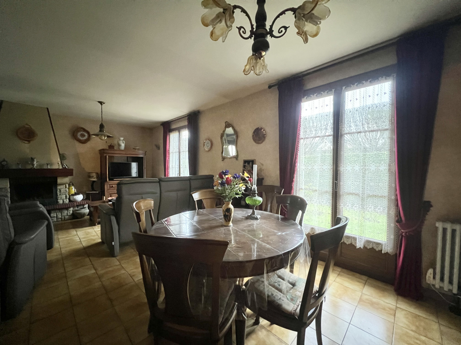 Entrée, séjour double avec cheminée, cuisine équipée, toilettes.